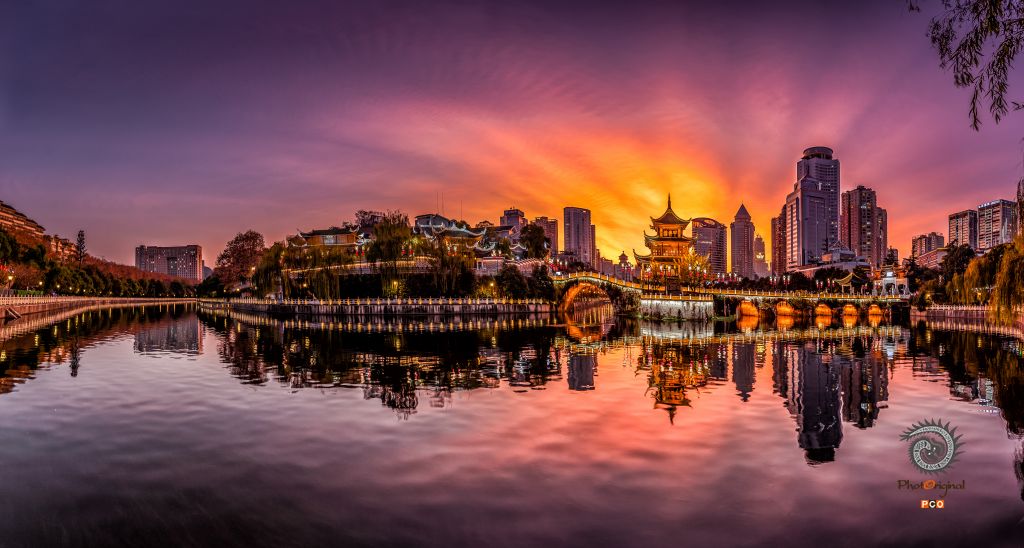 拍摄于2019年12月15日,太阳刚落下地平线,云彩变成红色,现代建筑与古建筑被云彩映衬得美丽至极。