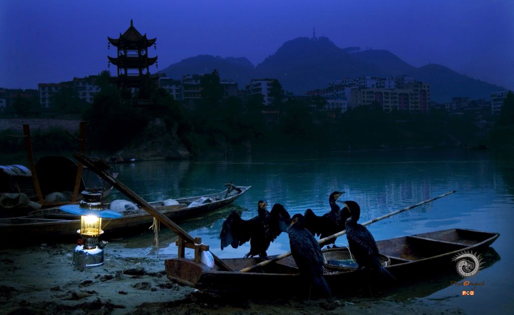 铜仁江城,锦江河畔,渔船泊岸,鱼鹰蓄势待行。