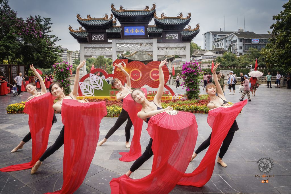 7月1日,在甲秀楼前的舞者们用红色的扇子为在建党百年献上舞蹈。