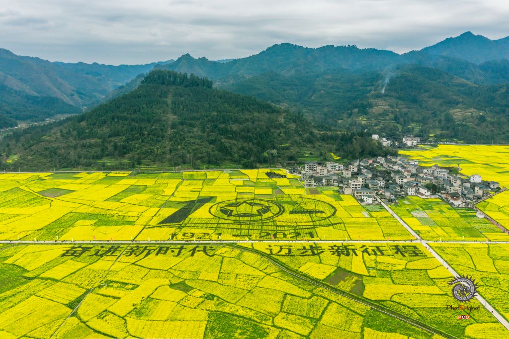 阳春三月,铜仁市瓦屋乡万亩油菜花竞相绽放,游客络绎不绝。花丛中“奋进新时代.迈进新征程”和纪念建党100周年图案格外醒目。寓意在中国共产党的正确领导下,农业、农村、农民发生了翻天覆地的变化,迈进了新的时代。