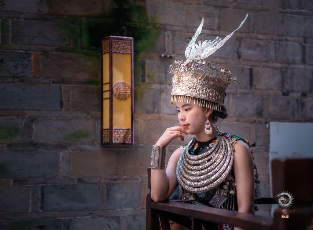一个淳朴、善良的苗家阿妹穿着盛装在古巷道休闲、享受着镇远古巷道美景。
