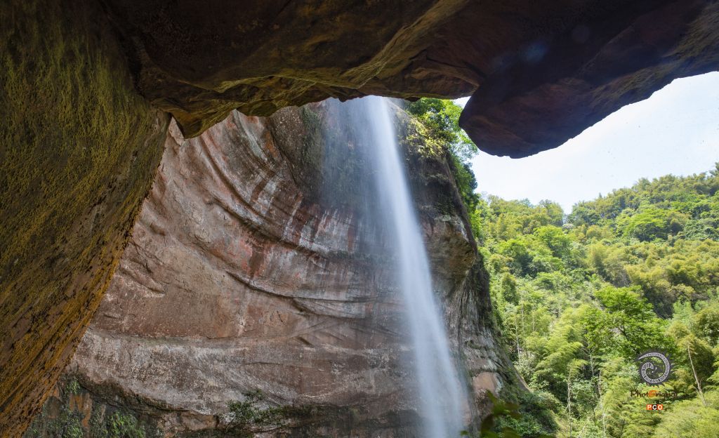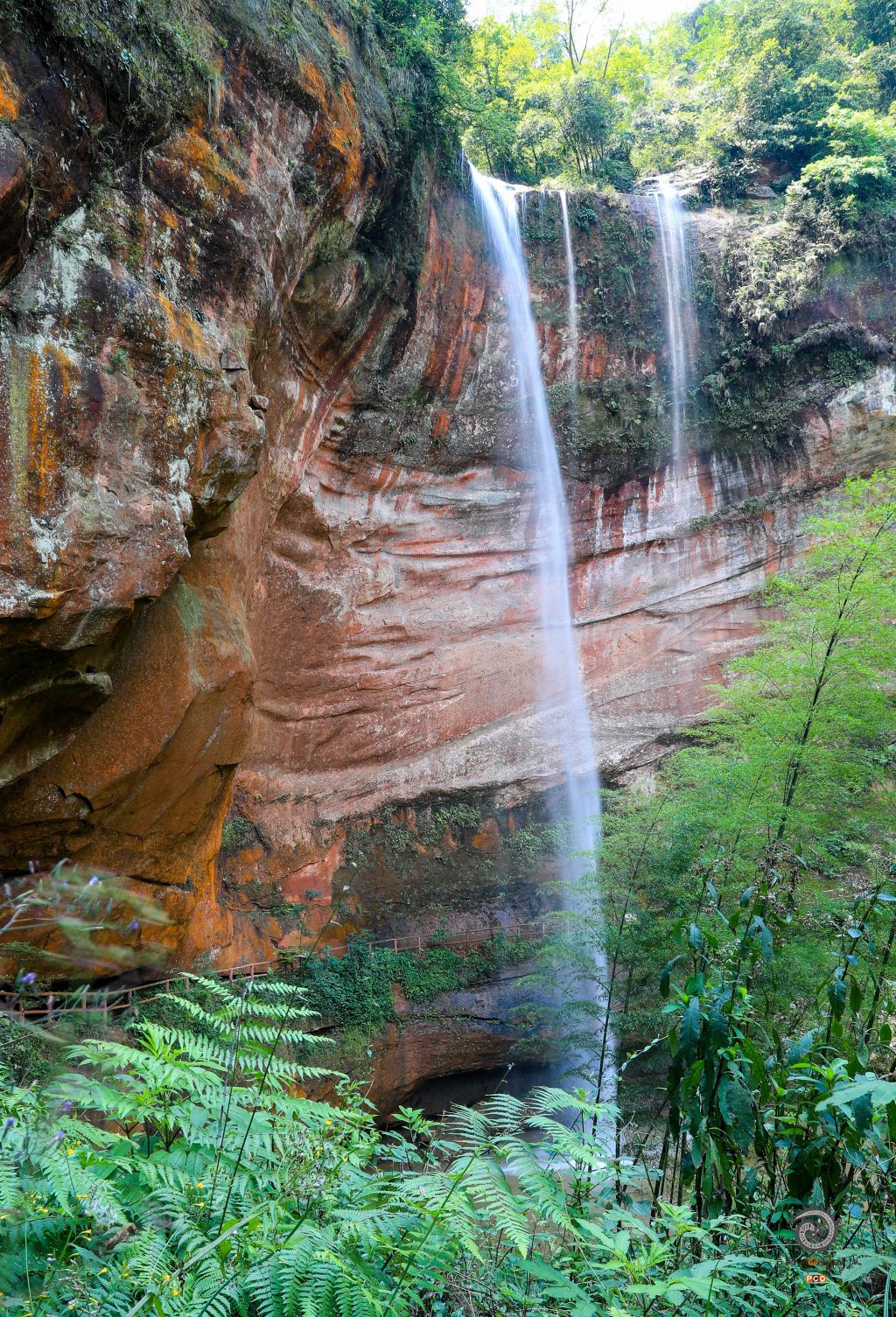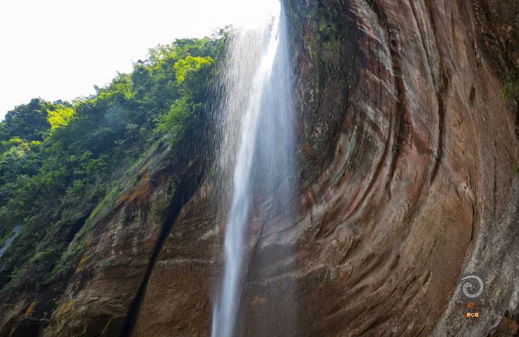 贵州赤水市长沙镇境内的锅圈岩瀑布,一块天然巨大的红色岩石,其间水花飞溅,形状如锅圈似的弧形岩圈,水雾弥漫,气势磅礴。