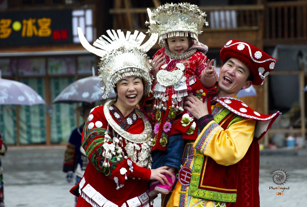 喜戴银饰是苗族姑娘的天性,她们挽发髻于头顶,戴上高约20公分左右,制作精美的银花冠,花冠前方插有6根高低不齐的银翘翅,上面大都打制着二龙戏珠图案。有的地区,银冠上除插银片外,还插高约1公尺的银牛角,角尖系彩飘,更显的高贵富丽。银冠下沿,圈挂银花带,下垂一排小银花坠,脖子上戴的银项圈有好几层,多 以银片打制花和小银环连套而成。前胸戴银锁和银压领,胸前、背后戴的是银披风,下垂许多小银铃。耳环、手镯都是银制品。只有两只衣袖才呈现出以火红色为主基调的刺绣,但袖口还镶嵌着一圈较宽的银饰。苗家姑娘盛装的服饰常常有数公斤重,有的是几代人积累继承下来的。素有“花衣银装赛天仙”的美称。苗家银饰的工艺,华丽考究、巧夺天工,充分显示了苗族人民的智慧和才能。苗族的服饰各地不完全相同,男子多用布包头,身穿短衣裤,但苗族妇女的穿戴普遍比较讲究,尤其是盛装,极为精美,花饰很多,有的裙子有四十多层,故名“百褶裙”。衣裙上面绣制的各种图案,古色古香,异彩纷呈。妇女擅长纺织、刺绣、蜡染,工艺十分精湛。看眼这幸福-家,他们的盛怨硝很精美.
