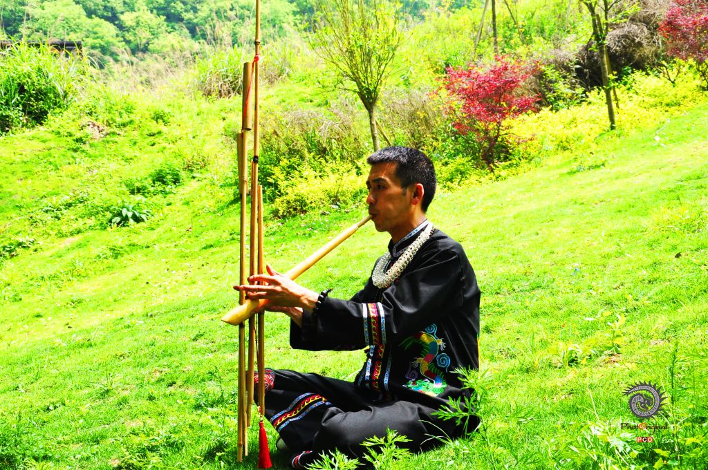 2017年4月摄于都匀 黔南州少数民族男子在茶园吹奏芦笙