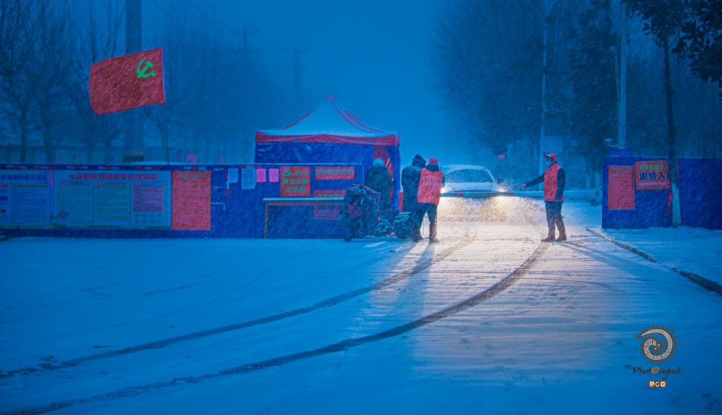 2020年2月16日(阴历正月二十三)晚间,江苏省连云港市赣榆区青口镇宋口村口,大雪纷飞中,两名党员志愿者和二名村干部在风雪中开展新冠肺炎防疫管控值勤工作。这是全村唯一的进出口,为了做好疫情管控工作,党员志愿者和村干部24小时、全天侯值守。