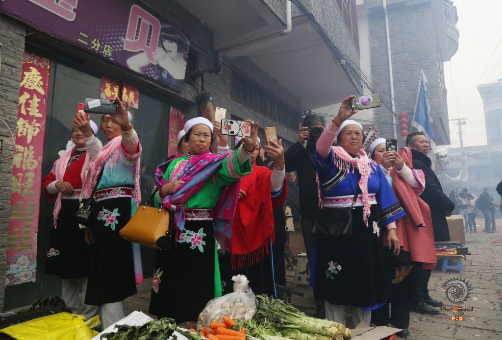 2019年2月22日,摄于贵州省安顺市西秀区吉昌屯传统民俗“抬汪公”活动现场。活动中,一群本村的屯堡妇女纷纷举起手机记录着精彩瞬间,尽情享受着摄影带来的快乐。在脱贫攻坚政策的扶持下,靠国家好政策和自己双手富裕起来的当地村民追求的是更加丰富多彩的文化生活。