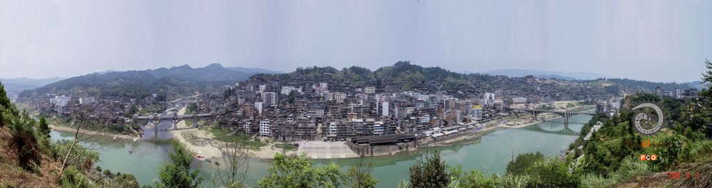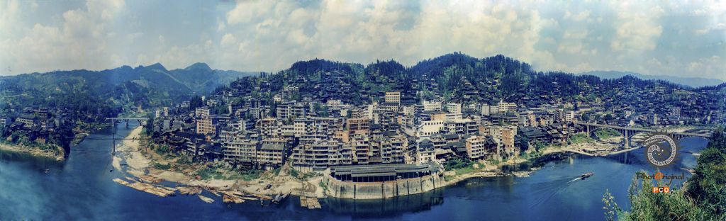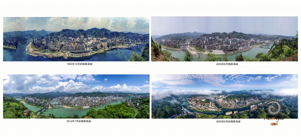 素有“杉木之乡”美誉的锦屏县,县城叫三江镇,清水江、小江、亮江3条江在县城交汇。照片的画面为清水江、小江在繁华的城区交汇。1994年开始在县城的同一角度用7张胶片拍了第一张照片,第4张为无人机航拍,时间跨度分别在4个不同的年代,用4张照片展现了锦屏县城镇建设近30年来发生的巨大变化。