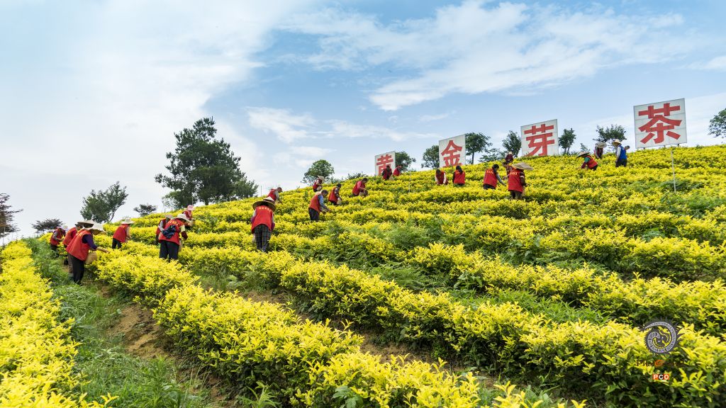 作品摄于2018年6月贵州省瓮安县建中镇黄红缨茶园。 瓮安黄金芽属于光照敏感型、黄色系变异绿茶新品种,因品种稀缺、培植难度大、管护成本高而被业界誉为“茶中大熊猫”,特点是“三黄”即干茶黄亮、汤色明黄、叶底纯黄,富含氨基酸。
