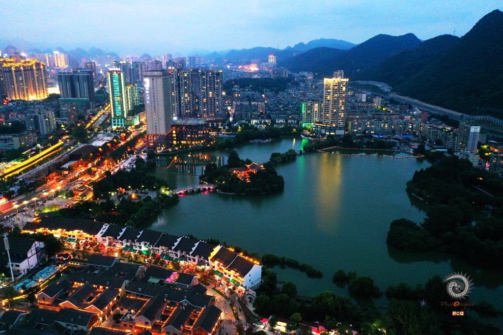 六盘水凤池周边,古镇映影在水中,星星点点的灯光让凤池十分温柔美丽。