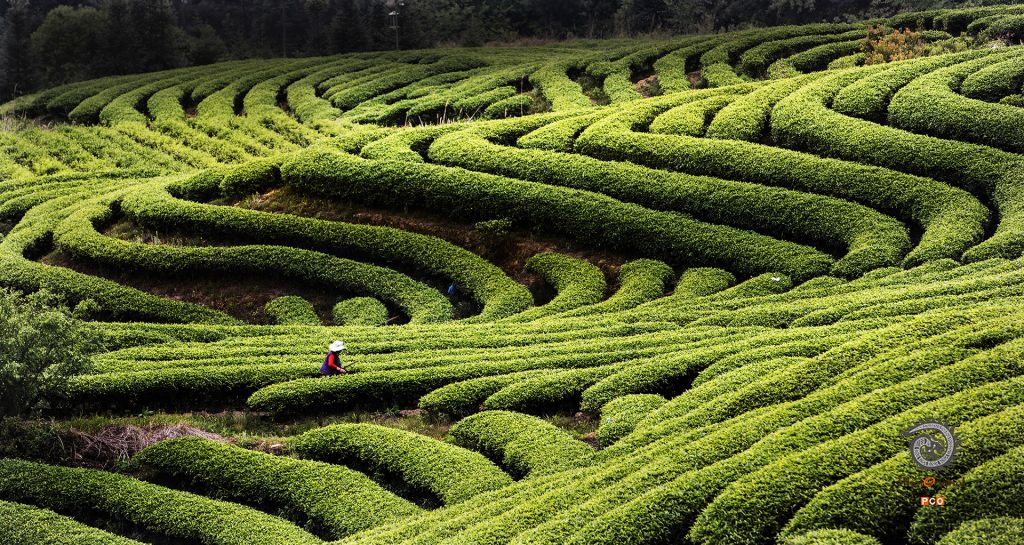 一缕缕的阳光洒在绿油油的茶园里,仿佛优美的旋律在随风飘荡,茶工的小红衣服就像五线谱上跳动的音符,形成一幅优美和谐的画面。