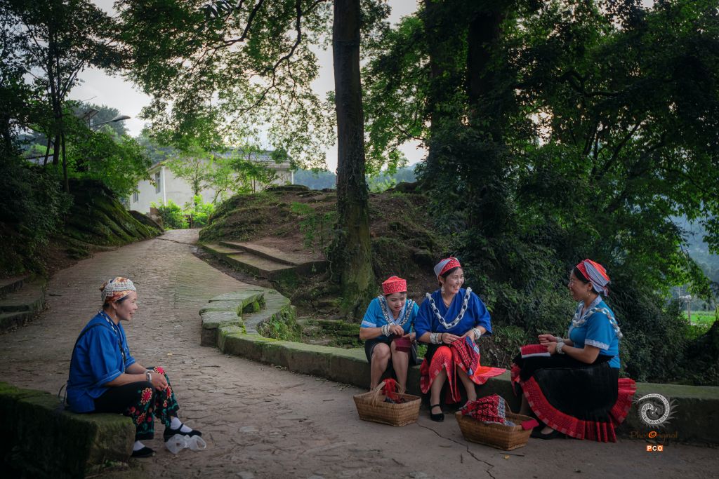 贵州省黄平县新州镇蒙加村,几位苗族姑娘聚在村边的大树下互教互学苗族刺绣。