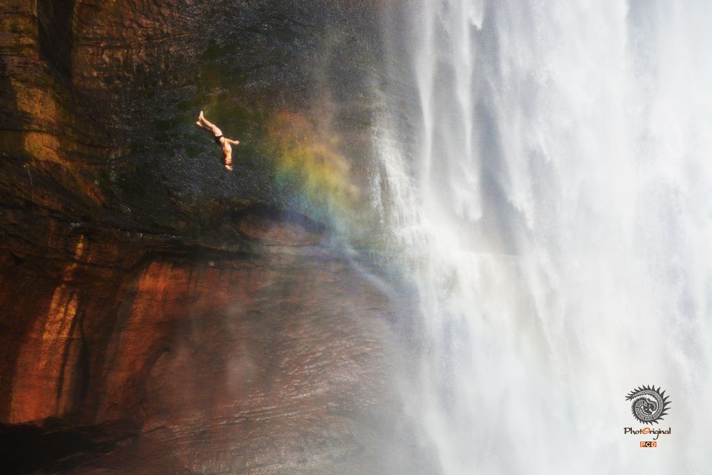 2016年拍摄于贵州省赤水市赤水大瀑布,跳水选手从瀑布旁飞跃而下,从接近50米的高空跃入水中。