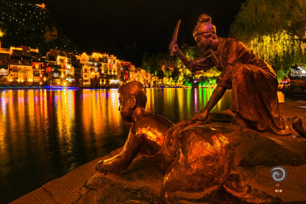 镇远古镇,舞阳河边,河边的雕像:玩耍的儿童与洗衣的妇女,构成一幅古城百姓生活的真实写照