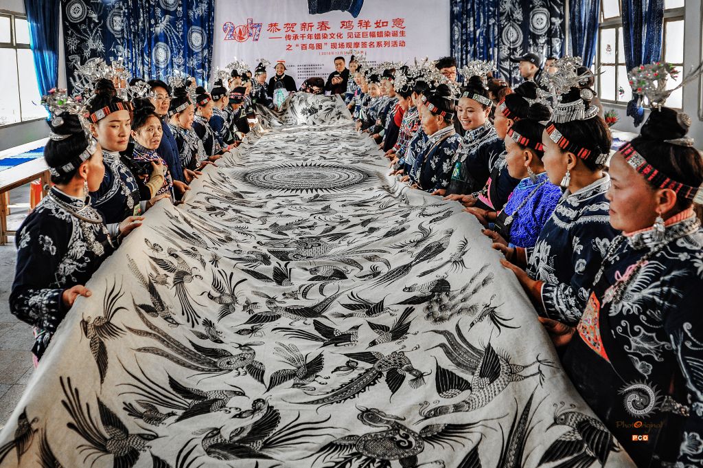 这幅长10米、宽1.6米的大型蜡染工艺美术作品《百鸟图》由贵州丹寨宁航蜡染有限公司策划并组织本企业的32位苗族画娘,于2016年12月耗时15天,采用国家级非物质文化遗产—丹寨苗族蜡染技艺进行创作,画面上绘画了数百只不同造形、不同神态的鸟,可谓千姿百态。拍摄于2016年12月30日。