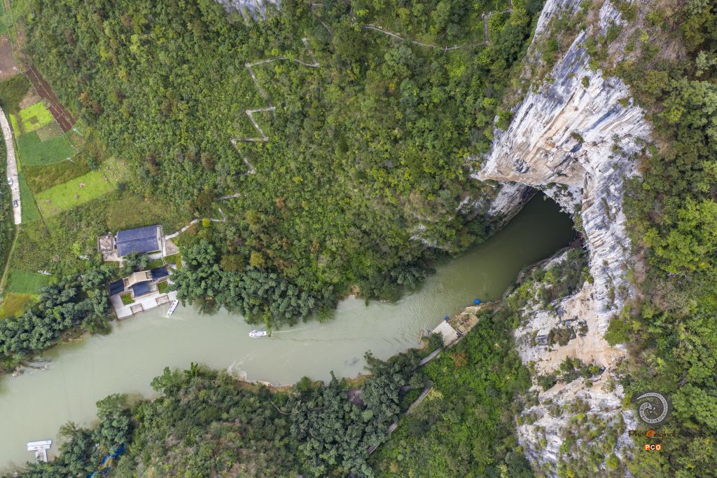 格凸河从洞中流出,游船行驶河上