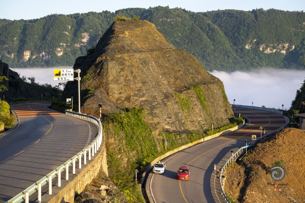 镇远芽溪境内盘山公里大拐弯处,因山高沟深,常年云雾升腾,拐弯处酷似宝瓶,早晨阳光照在彩色路面上,别有一番景象。
