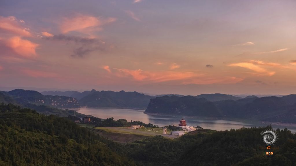 乌江飞龙湖,龙王庙在霞光中熠熠生辉。