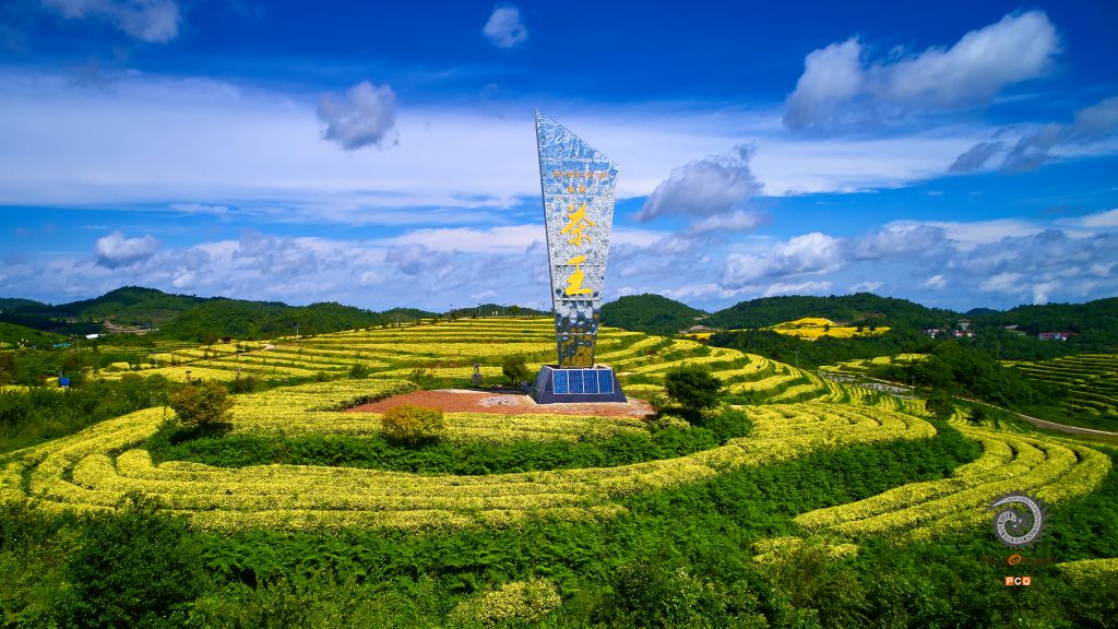 瓮安建中黄红缨茶业基地的特异品种绿茶类荣获《贵州省春季斗茶大赛金奖》的奖牌矗立在金黄色的茶山上