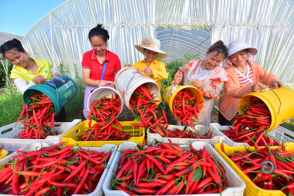 2021年7月12日,贵州省黔东南州锦屏县新化乡新化所村大棚蔬菜基地,农民正在采摘红辣椒。 近年来,锦屏县以“党支部+公司+合作社+基地+农户”的经营模式,建成标准化的大棚蔬菜基地,实行统一管理,统一出售,蔬菜主要销往广东、湖南、四川等全国各地,带动当地农民增收致富。