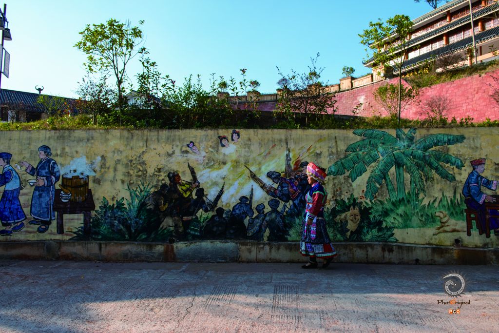 贵州赤水市元厚镇五星苗寨美丽的画廊和行人天然浑成,民族风味突出。