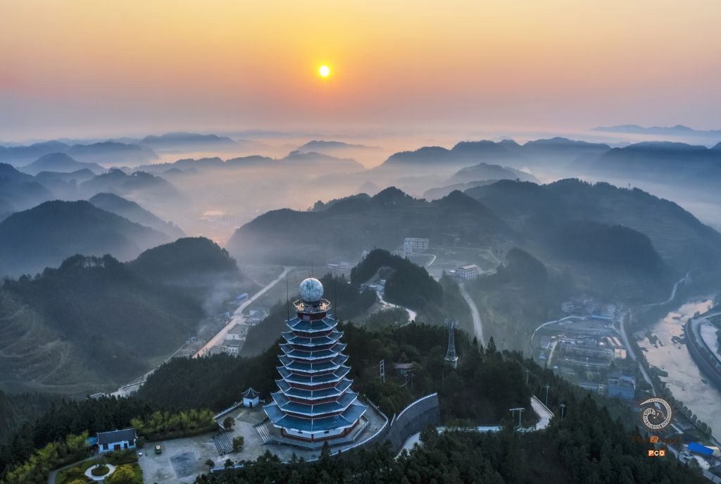 雷达气象塔好似在与太阳对话,山下的云雾也在随波起舞。