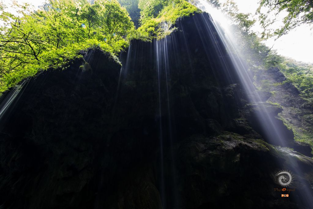 铜仁大峡谷的一线天景点,抬头仰望山顶的泉水哗哗流下,如丝如雾,非常壮观。