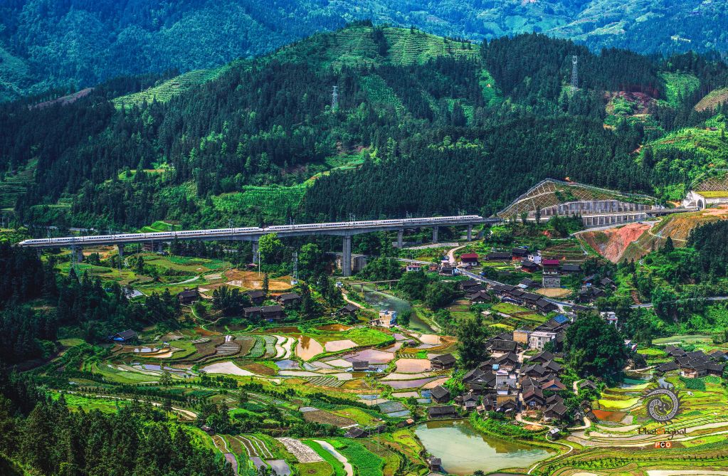 图为动车驶过贵广高铁贵州省榕江县平江乡加会村大桥。2015年5月摄于加会村。
