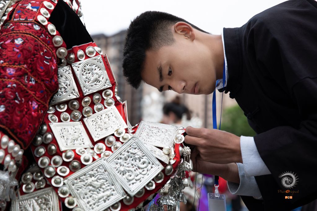2021年4月台江姊妹节,一位男生专心为女生整理苗装服饰