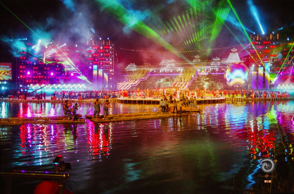 荔波樟江两岸华灯异彩,布依族少男少女划着竹排夜游樟江