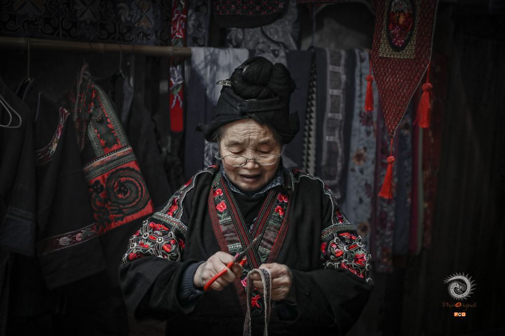 作品拍摄于贵州省黔东南苗族侗族自治州雷山县朗德上寨,虽然寨子受到现代发展的影响,但那里的老人们依旧坚持传统服饰的手工制作,从种棉、采棉、纺线、织布、染色、制衣、刺绣,每一步她们都亲力亲为,坚持传承苗绣这一非物质文化遗产。照片中的奶奶正是在向我们演示传统苗绣的刺绣方法,但据奶奶所说,目前会传统苗绣的人们已经越来越少了。