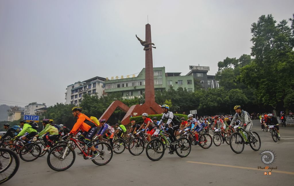 赤水市《》奇兵》雕塑下自行车越野赛整队出发开始比拼。