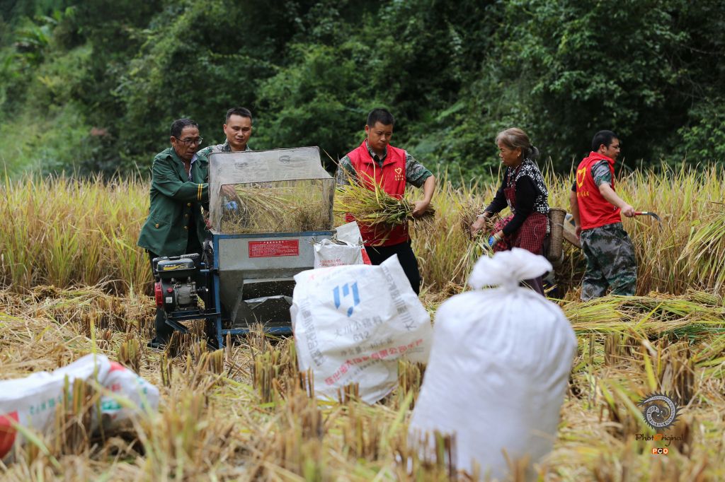 2020年9月21日,志愿者在贵州省锦屏县隆里乡华寨村帮助村民抢收稻谷。