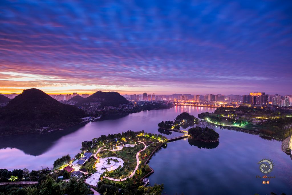 拍摄于2019年10月29日,安顺虹山水库。凌晨五点出发,到达拍摄点刚好六点,朝霞开始出现。红色的朝霞把城市映衬得美丽至极。