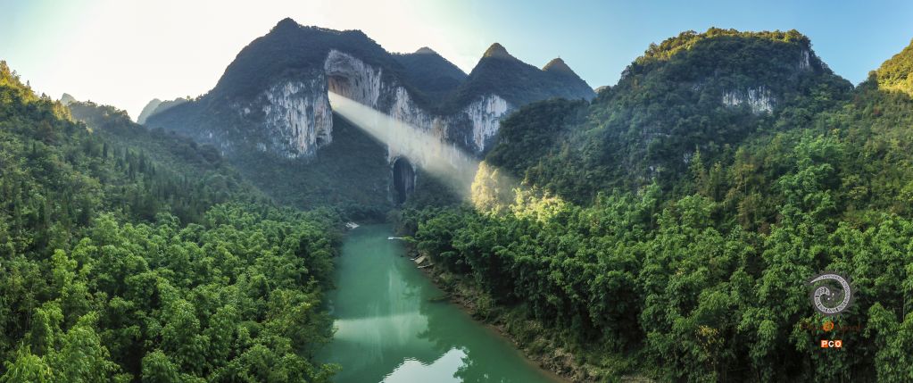 紫云格凸河从地下穿洞而出,太阳穿过山体上面的穿洞投射出罕见光柱,神奇而神秘。