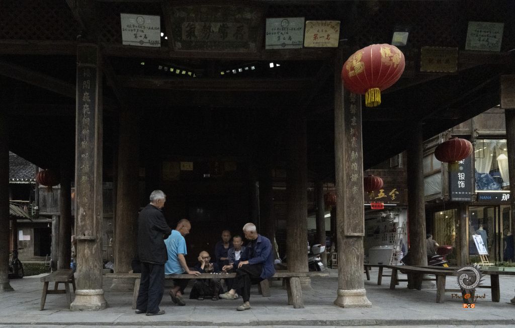此片拍摄于2021年5月贵州黔东南肇兴侗寨,几位侗族老人在八角信团鼓楼下面正在下棋,其中二人对弈,三人观战,表情专注,其乐融融,印证了鼓楼楹联:鼓乐声声京城震动雄证当今盛世;鼓楼巍巍侗寨欢呼讴歌天下太平。