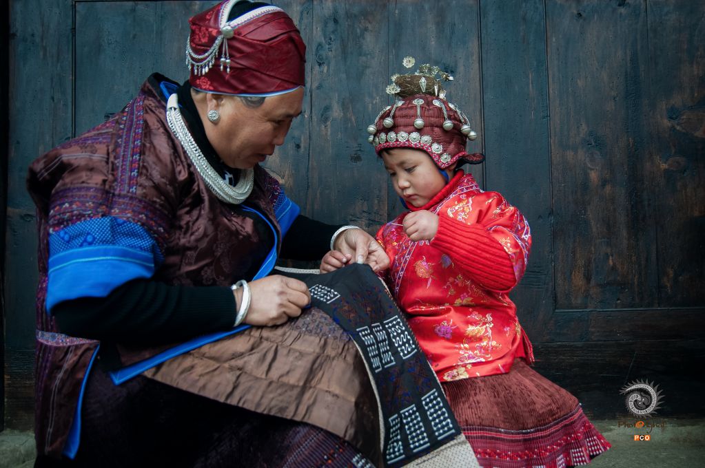 贵州省黄平县谷陇镇山坪村太平洞苗寨的一户苗家屋檐下,一位小姑娘正在专心地跟着奶奶学刺透。