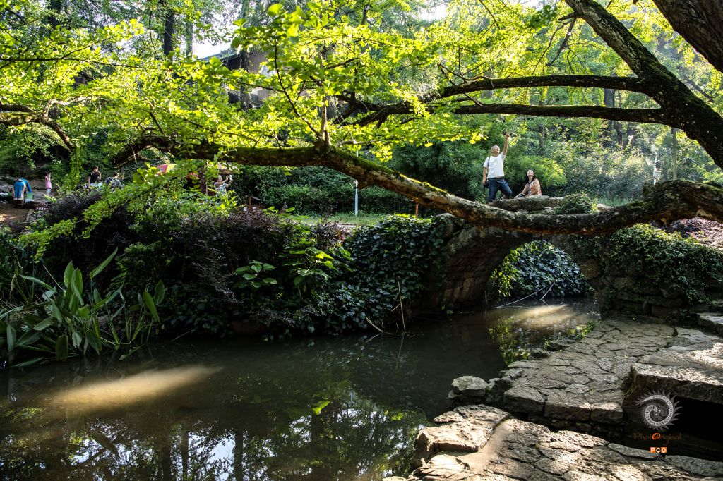 2019年8月11日,两名旅客在盘州市妥乐村的小桥上赏风景。