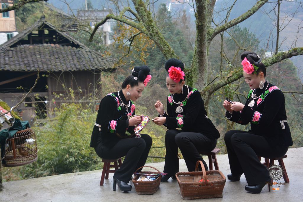 虎阳村苗女在户外刺绣。