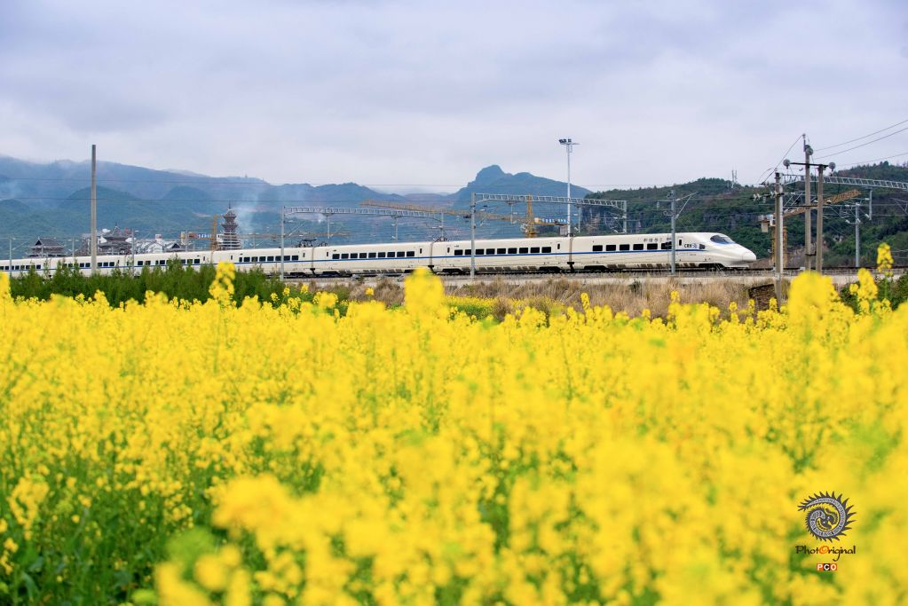 2019年3月1日拍于贵州省从江县洛香镇。春暖花开的时节,一列动车从从江高铁站开出,行驶在油菜花海中。