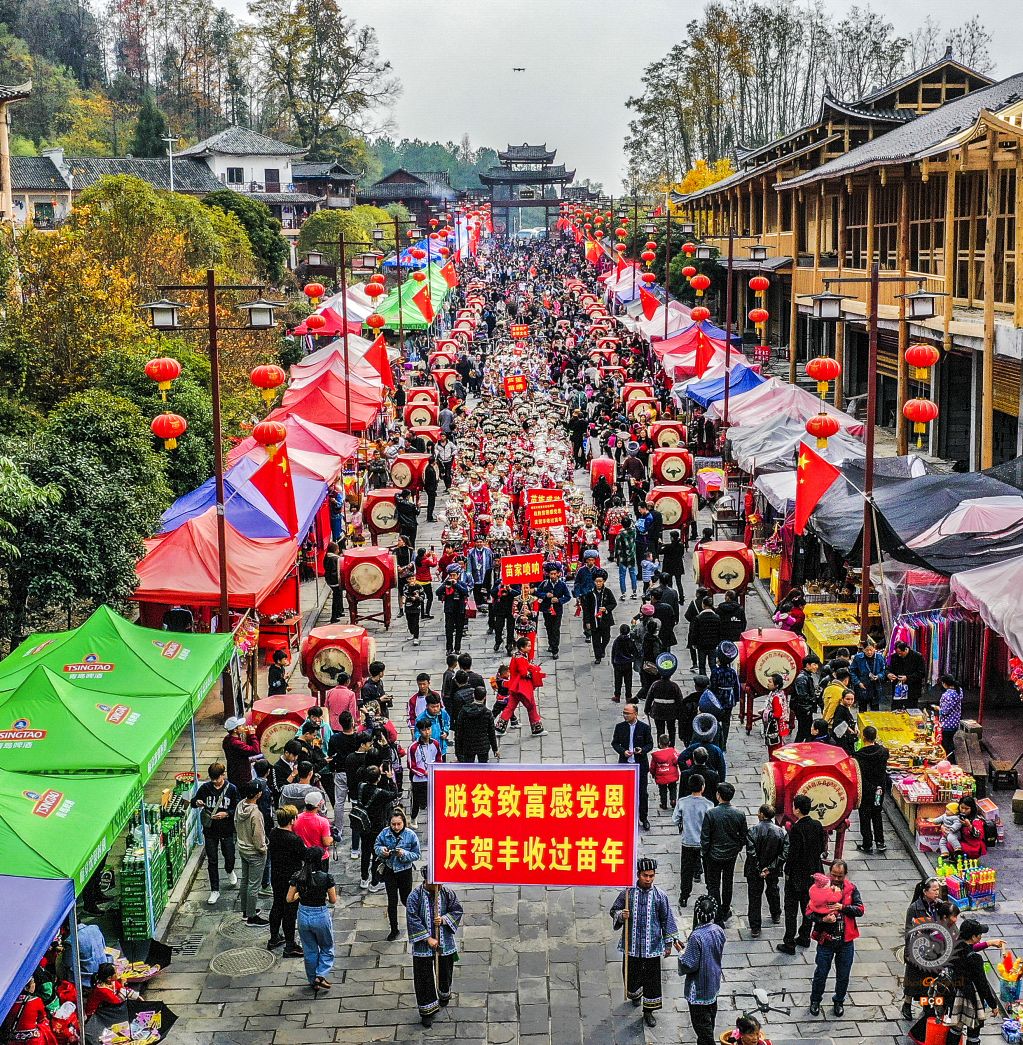 党和国家的脱贫政策给人民群众带来了无限的好处,贫困山区的人民在共产党人的带领下,战天斗地,攻克贫困关,在2020年已实现了全面脱贫,为感党恩,节日期间盛装游行,喜庆脱贫致富,过上了小康生活。