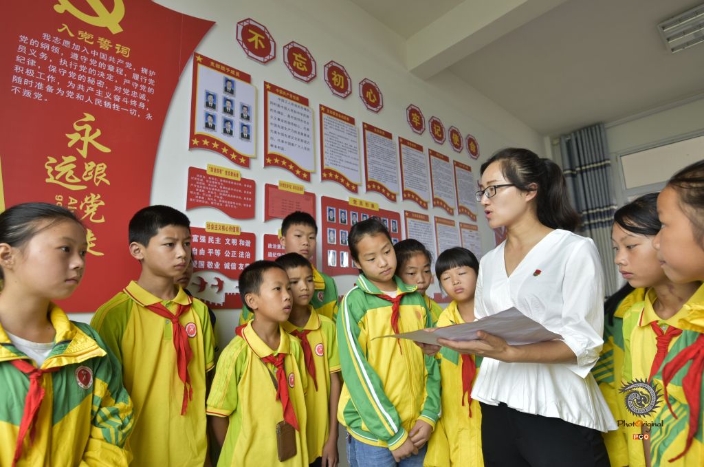 2019年6月25日,贵州省黔东南州锦屏县新化小学的孩子们在党员活动室听老师讲党史知识。