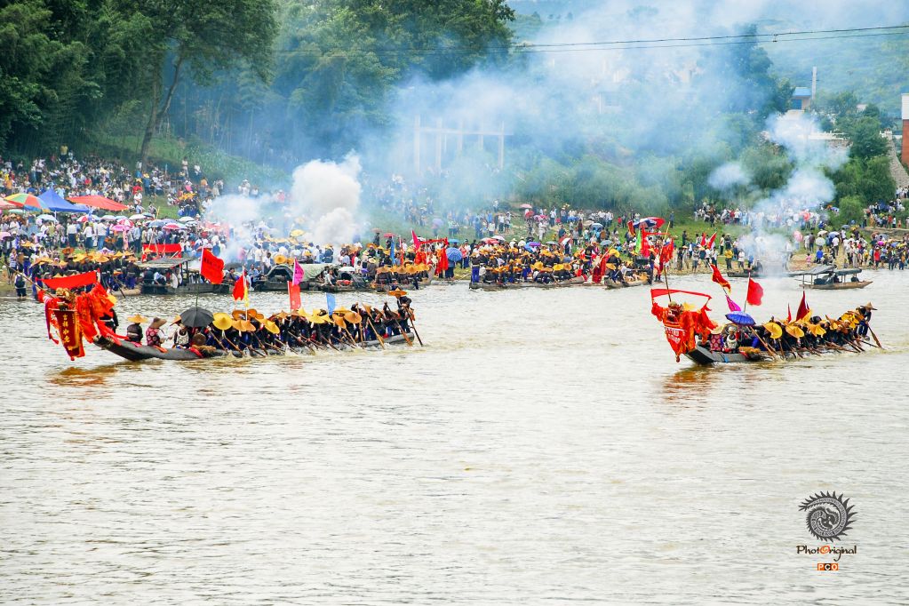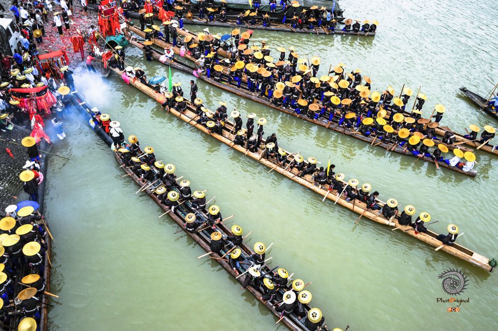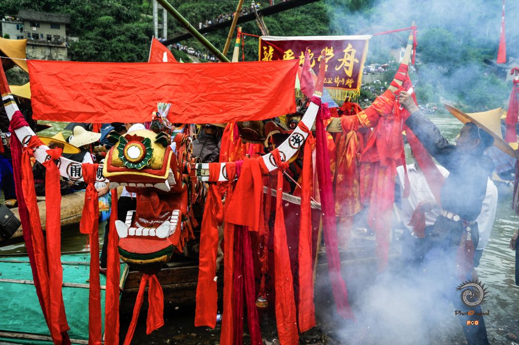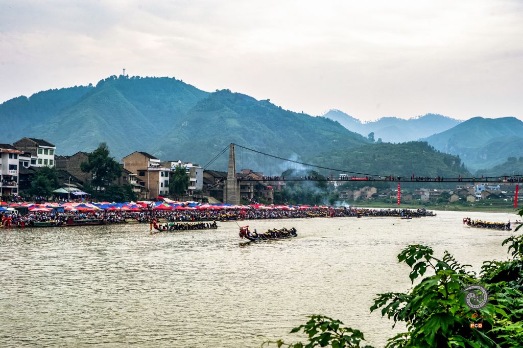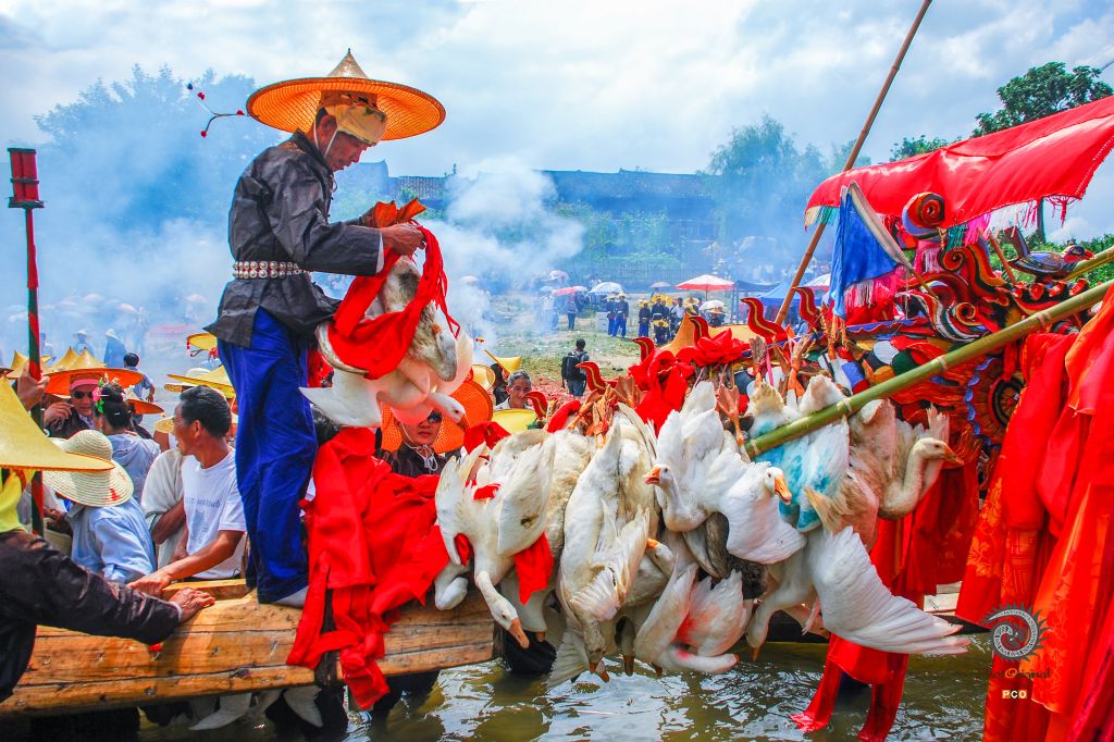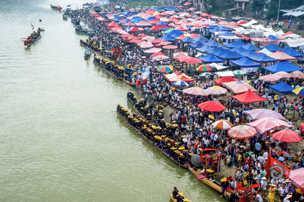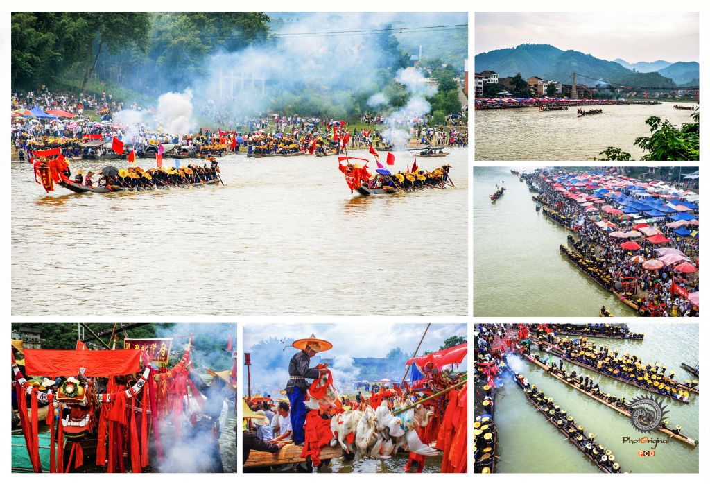 在施洞镇清水江,“被誉为世界独一无二”的台江苗族独木龙舟节的比赛当天,各乡、村寨独木龙舟从各自村落下水后集中塘龙村河段,各龙舟在河中来回竞渡风情展示,让家人亲友朝拜。火铳、鞭炮声响彻云霄,各寨龙舟的三亲六戚纷纷前来接龙,在龙头上挂鸭鹅。同时,给龙舟龙主、桡手敬酒,表示祝福,祈求平安。一整天时间下来,施洞码头人头攒动,热闹非凡。