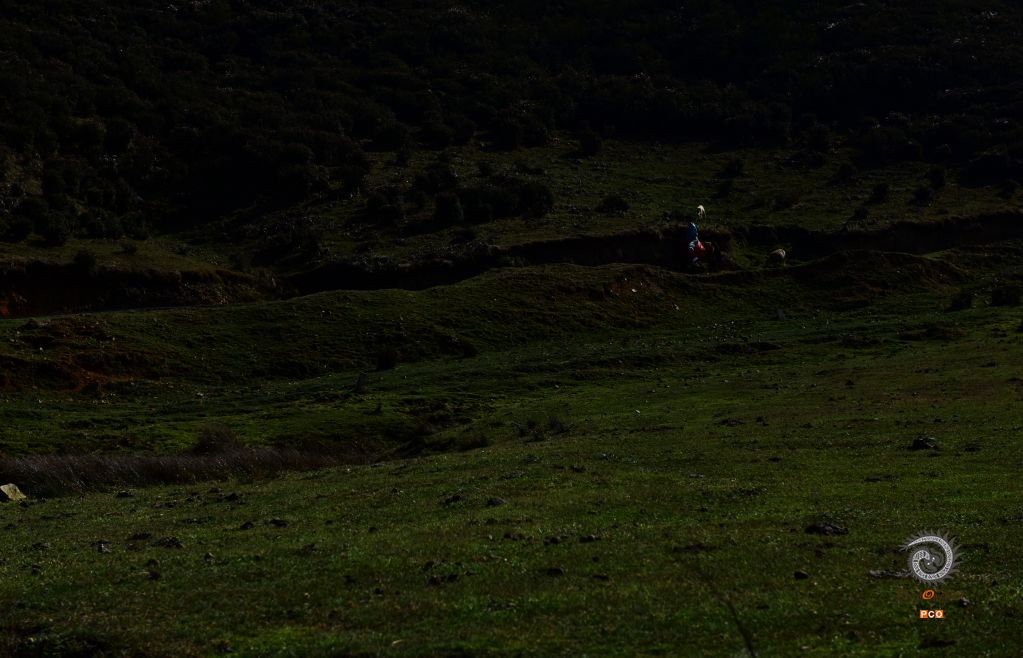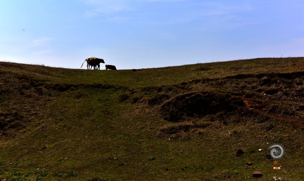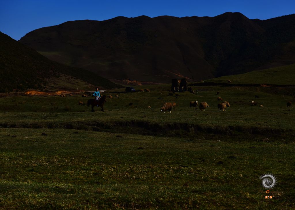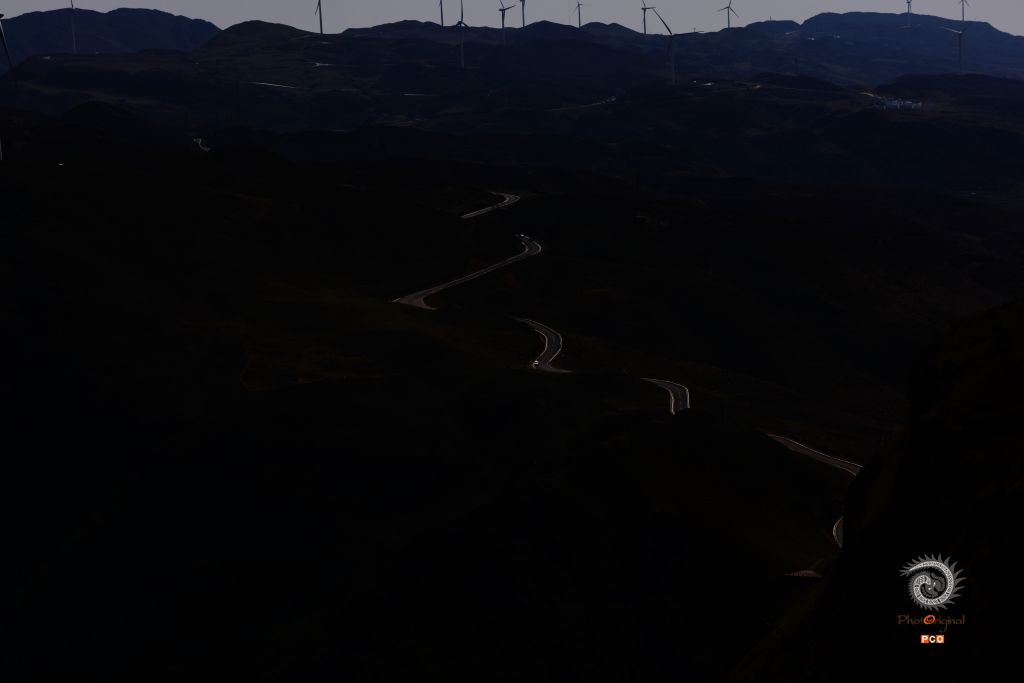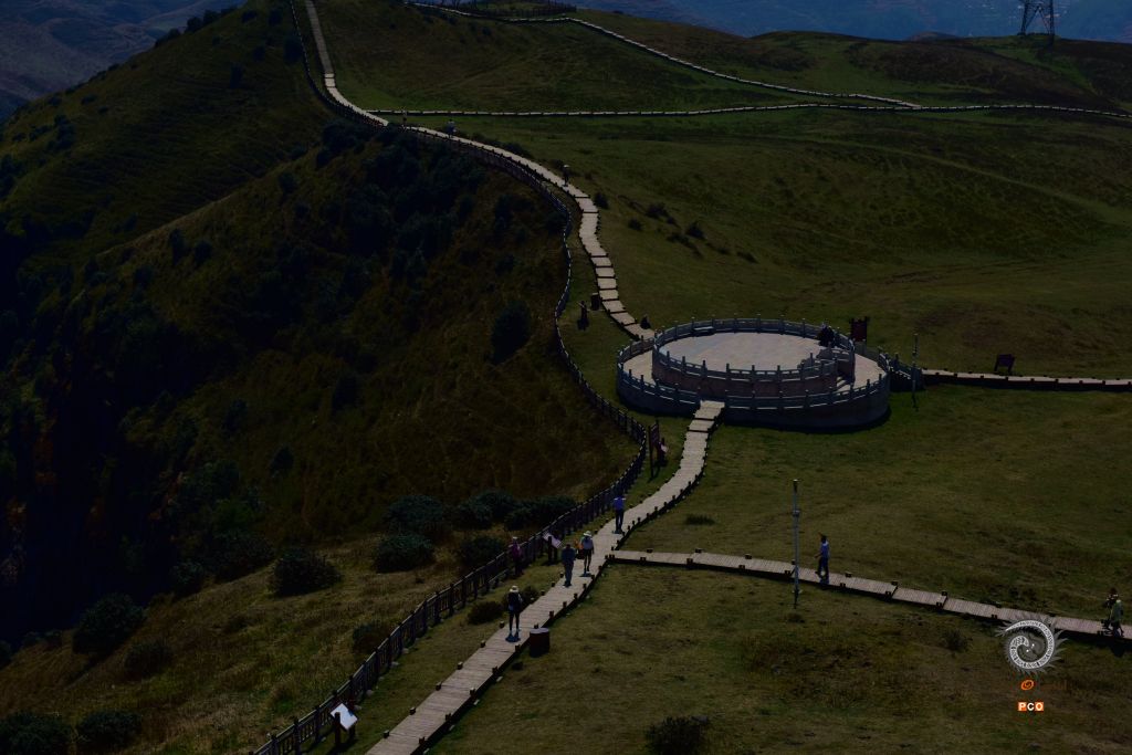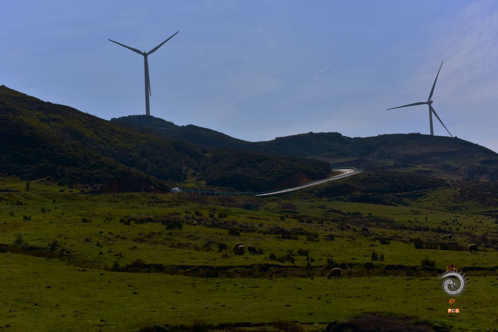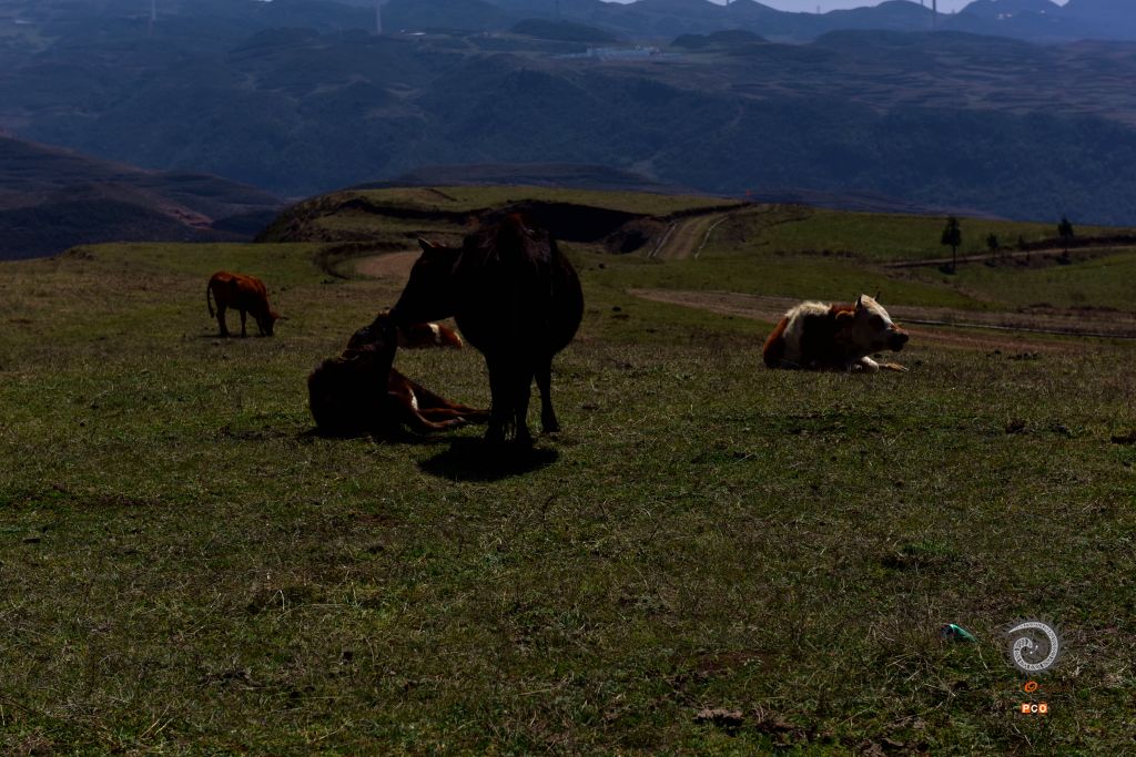 拍摄于贵州六盘水乌蒙大草原。这里的草原保护极好,放眼无边的草原,举目辽阔的长空,恰如“极目青天日渐高,王龙盘曲自妖娆。无边绿翠凭羊牧,一马飞歌醉碧宵”之意境,嵌入眼里,醉在心里。风清草动,天高山远,云白天蓝,是这么的真真切切,是这么的纯纯粹粹,不染纤毫尘埃;满眼的草甸延绵起伏,明媚的阳光一泄无余,每一处草甸如一块块碧绿的地毯;俯瞰山谷,景色更奇,层层的天然林色彩班斓,满目的红似火的枫叶,薄雾如一条洁白的哈达环绕着布依村寨,隐隐约约,朦朦胧胧,如诗如画,恍如仙境;远望山坡高处矗立着一个个巨大的三叶风力发电机,站成了一朵朵银白色的野花儿,随风不停舞动着。草原的尽头,天地相连相融,黛绿的牧草投入到了蓝天的怀抱中,娓娓叙说着那个美丽的童话故事。
