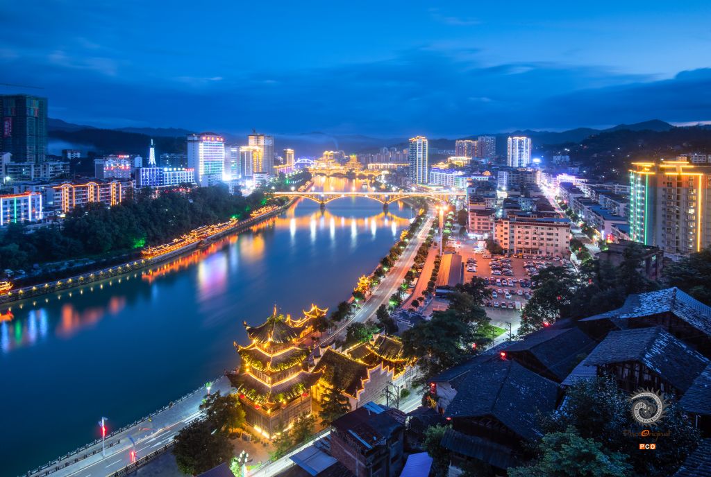 在贵州省黔东南苗族侗族自治州锦屏县城的清水江畔灯光熣灿,风雨桥、风雨桥及滨江景观倒映在江面,流光溢彩的夜景美美不胜收。
