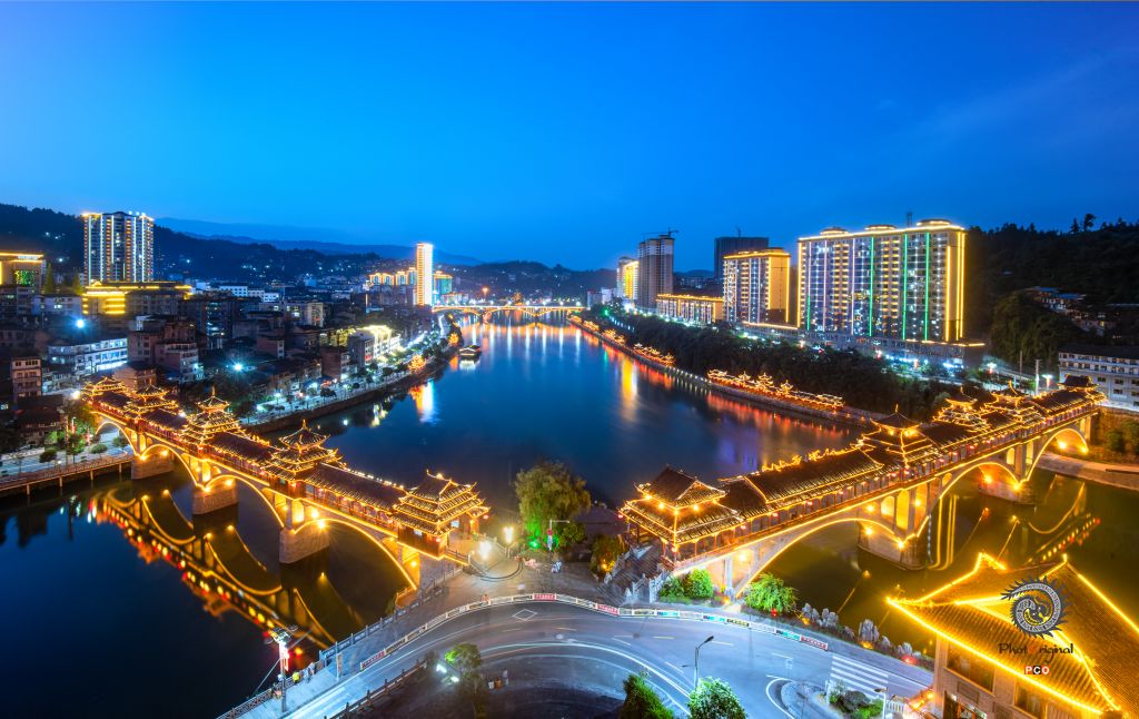 在贵州省黔东南苗族侗族自治州锦屏县城的清水江畔灯光熣灿,风雨桥、风雨桥及滨江景观倒映在江面,流光溢彩的夜景美美不胜收。