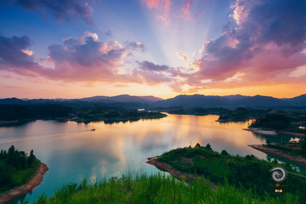贵州省黄平县,美丽的舞阳湖霞光映照,水天一色,美不胜收。