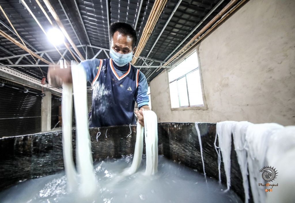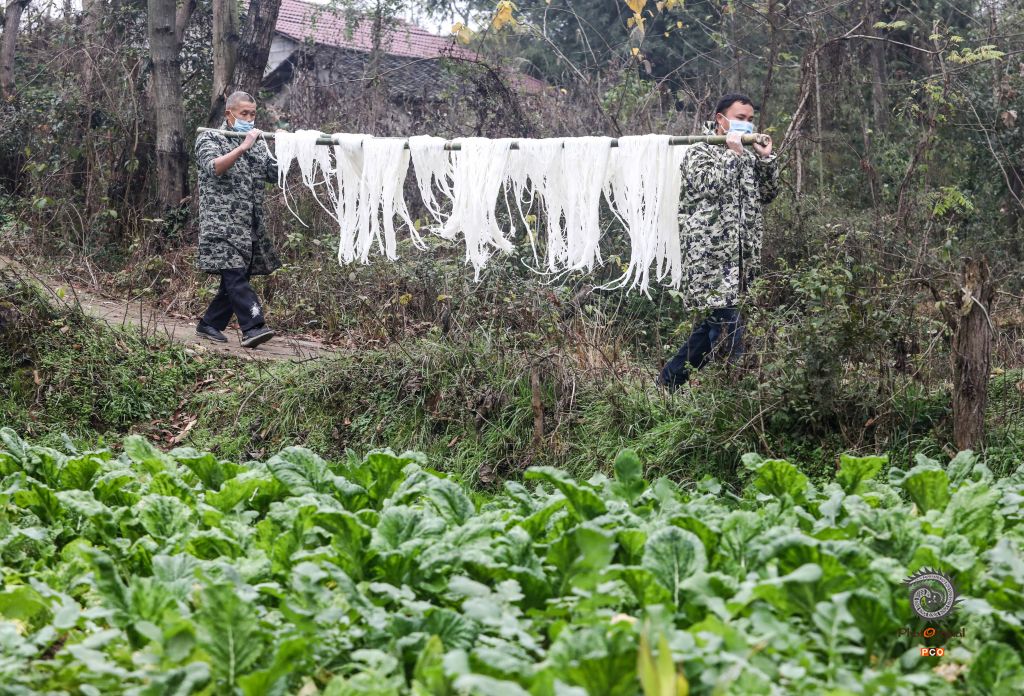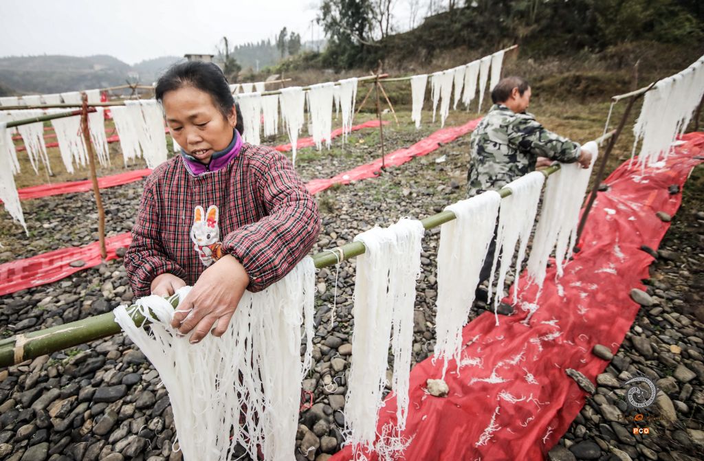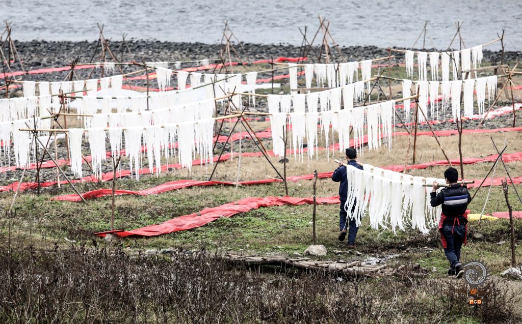 2020年1月5日,随着年味渐浓,贵州省铜仁市玉屏侗族自治县大龙街道鲢鱼塘村的村民们在河坝边搭起简易架子,忙着晾晒玉米粉,提前置备年货。 玉米粉,俗称苞谷粉,是玉屏当地极具特色的手工制食品,在大龙街道鲢鱼塘村,制作苞谷粉手艺已传承了几代人,村子里几乎每家每户都会制作苞谷粉。苞谷粉味道鲜美、营养丰富、口感好,与熬制的鸡汤或是其它汤搭配,味道堪称一绝。
