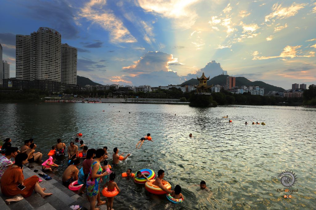 锦江夏日,市民在日落傍晚时分,来到锦江游泳消夏。
