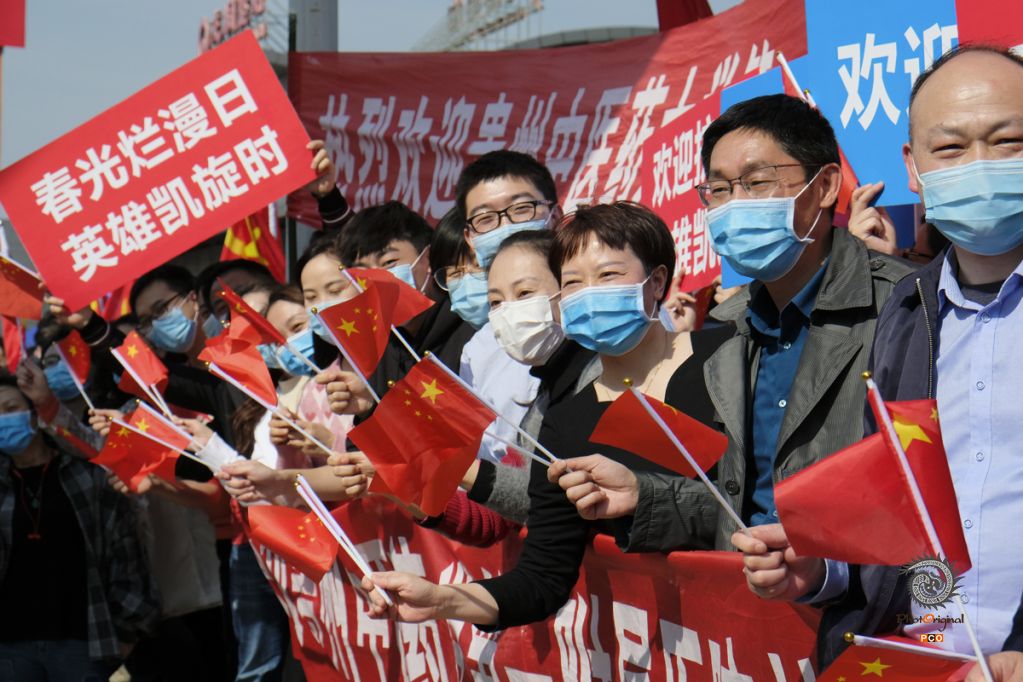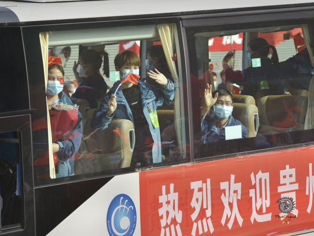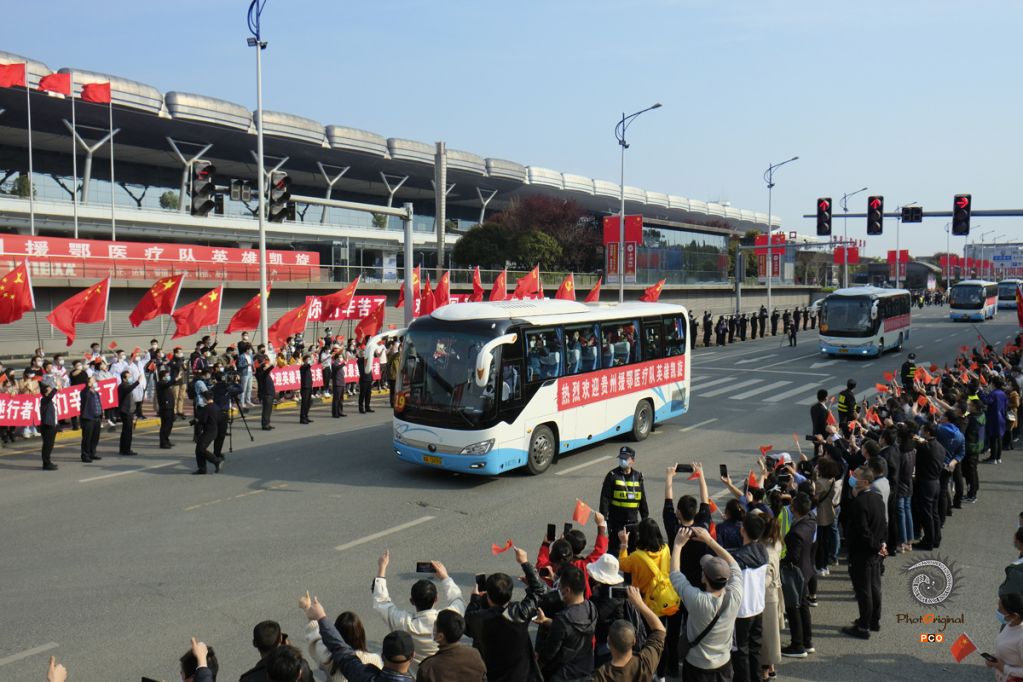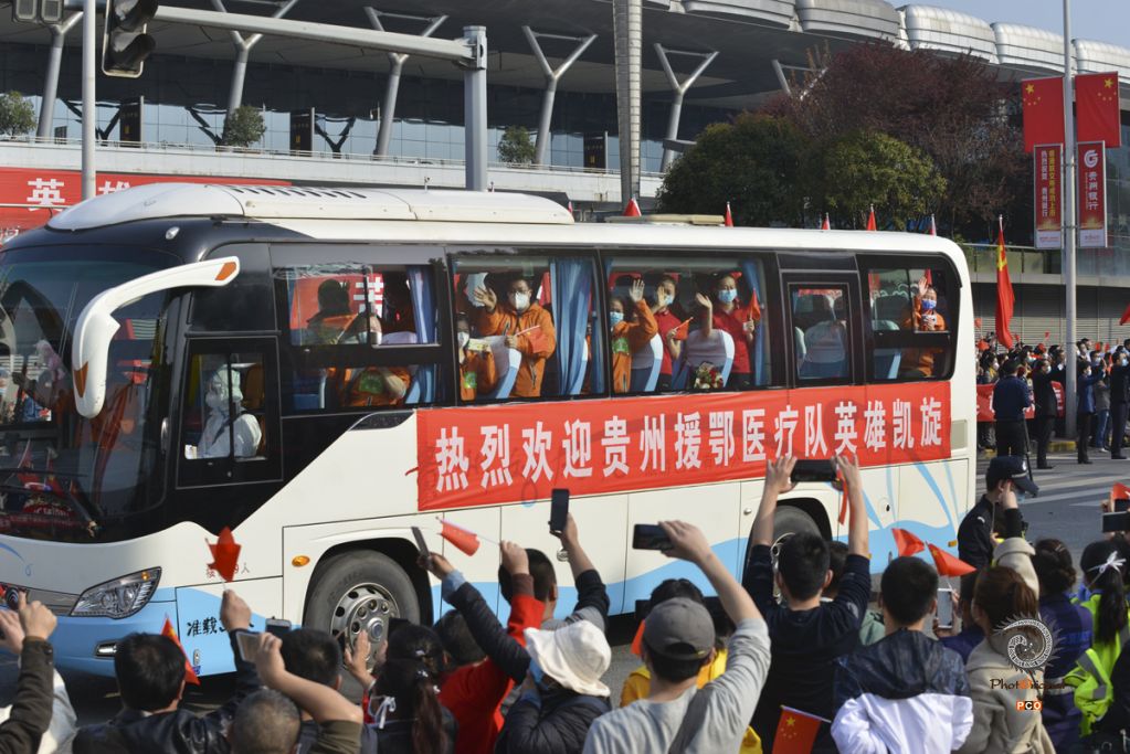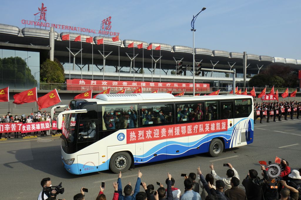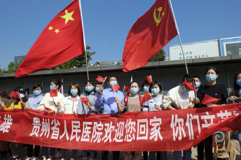 2020年3月20日拍摄贵阳机场。贵州省支援湖北鄂州市疫情防治的第一、四、九批援鄂医疗队首批433名队员圆满完成各项任务。在贵阳机场1号大道两边,早以等候欢迎各医院的队伍和市民群众手举“热烈欢迎贵州援鄂医疗队英雄凯旋”“你们辛苦了”等横幅,挥舞着国旗,齐声欢呼“英雄凯旋、欢迎回家”。
