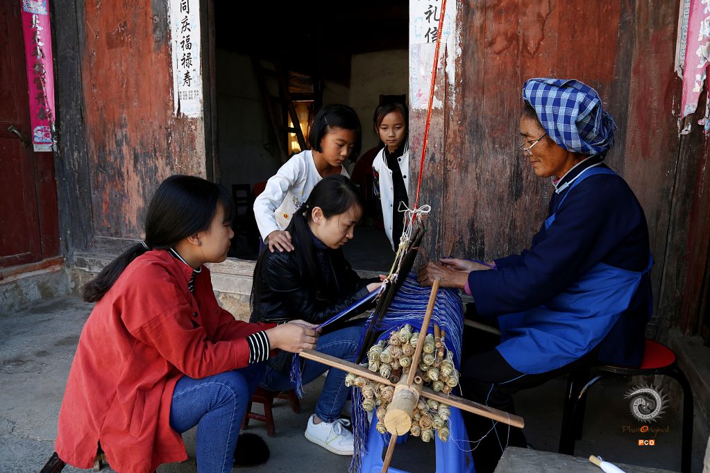 摄于贵州省安顺市镇宁县木役乡,一位布依族老人在自家堂屋前,正在向她的几个外孙传授本民族的传统土布织布法,老人耐心地教,小朋友们认真地学,一个民族的传统技艺就这样在时光岁月里代代相传,永不消失。